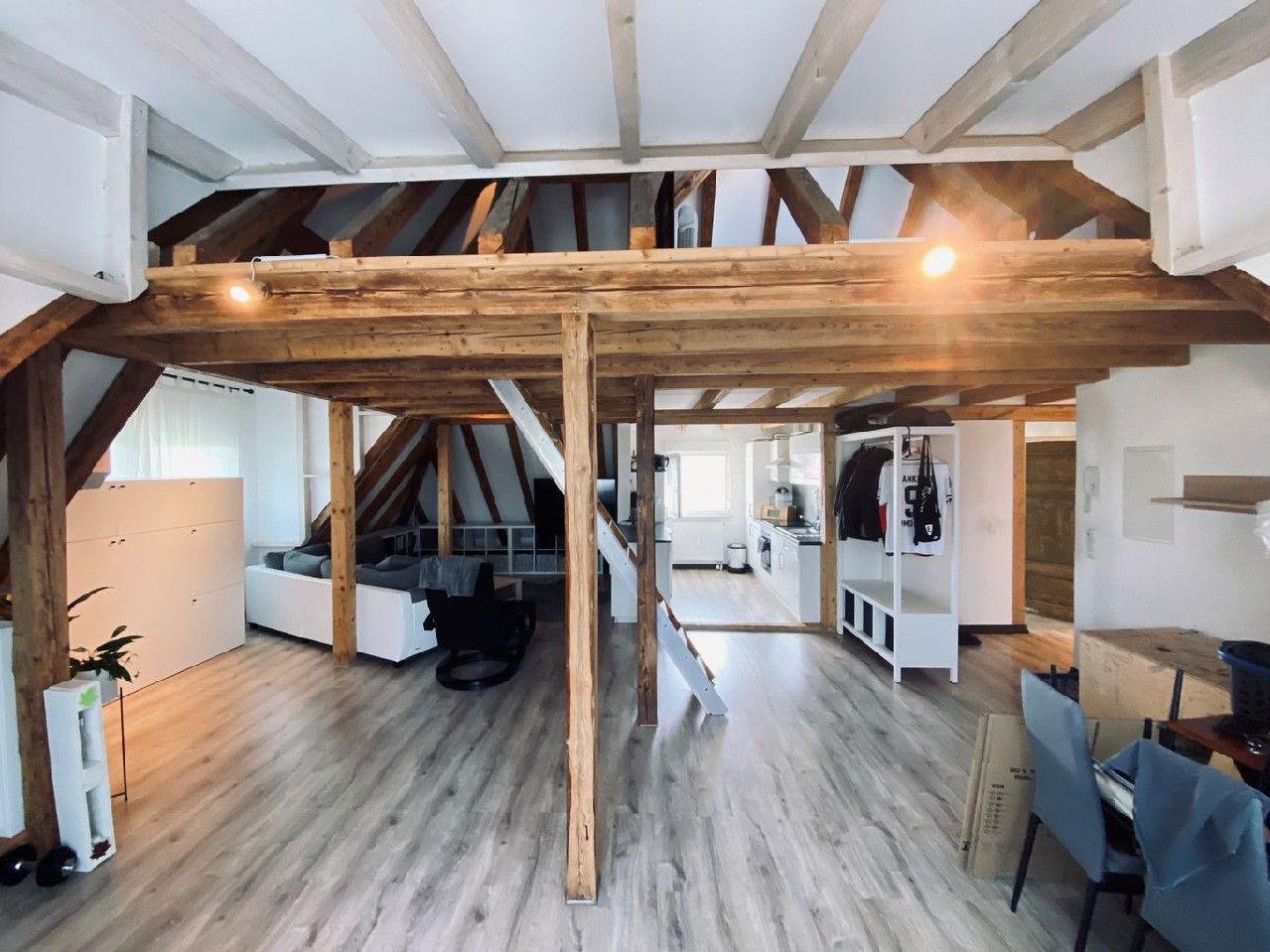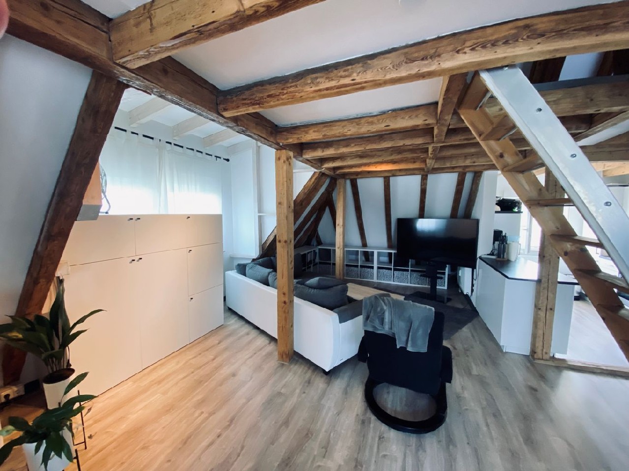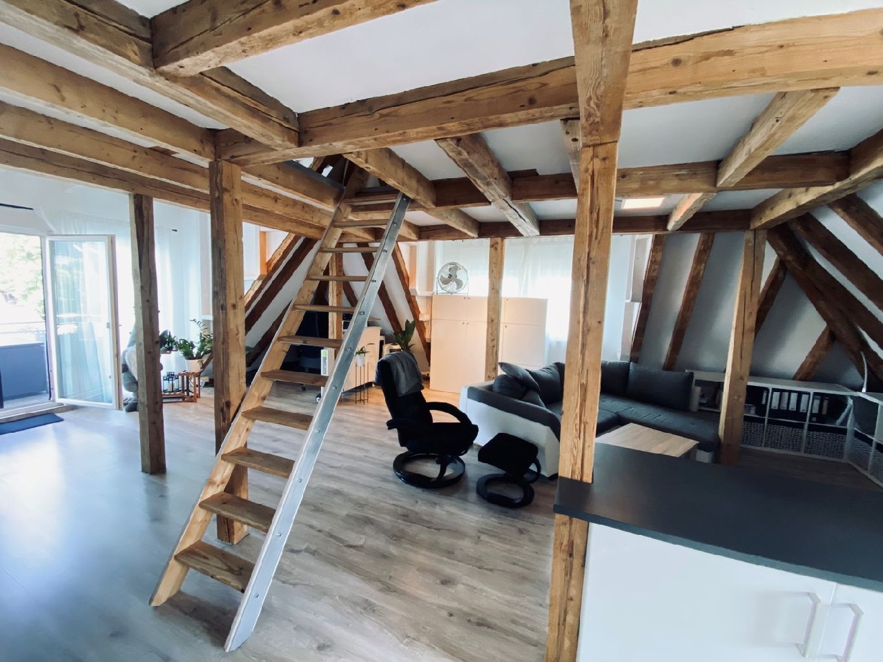In fußläufiger Nähe zum Bahnhof wurde dieses 6-Familienhaus völlig neu gestaltet. So entstand im Dachgeschoss ein Loft. Ein großer Raum, alles offen - außer natürlich das Bad. Das Tageslichtbad ist mit Dusche und sogar mit einem Bidet ausgestattet. Eine Treppe führt in den offenen Spitzboden, hier steht das Bett.