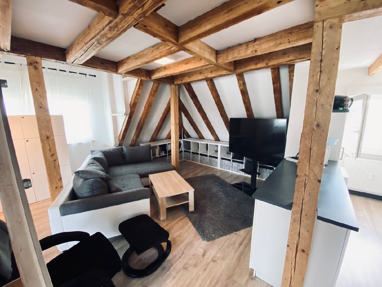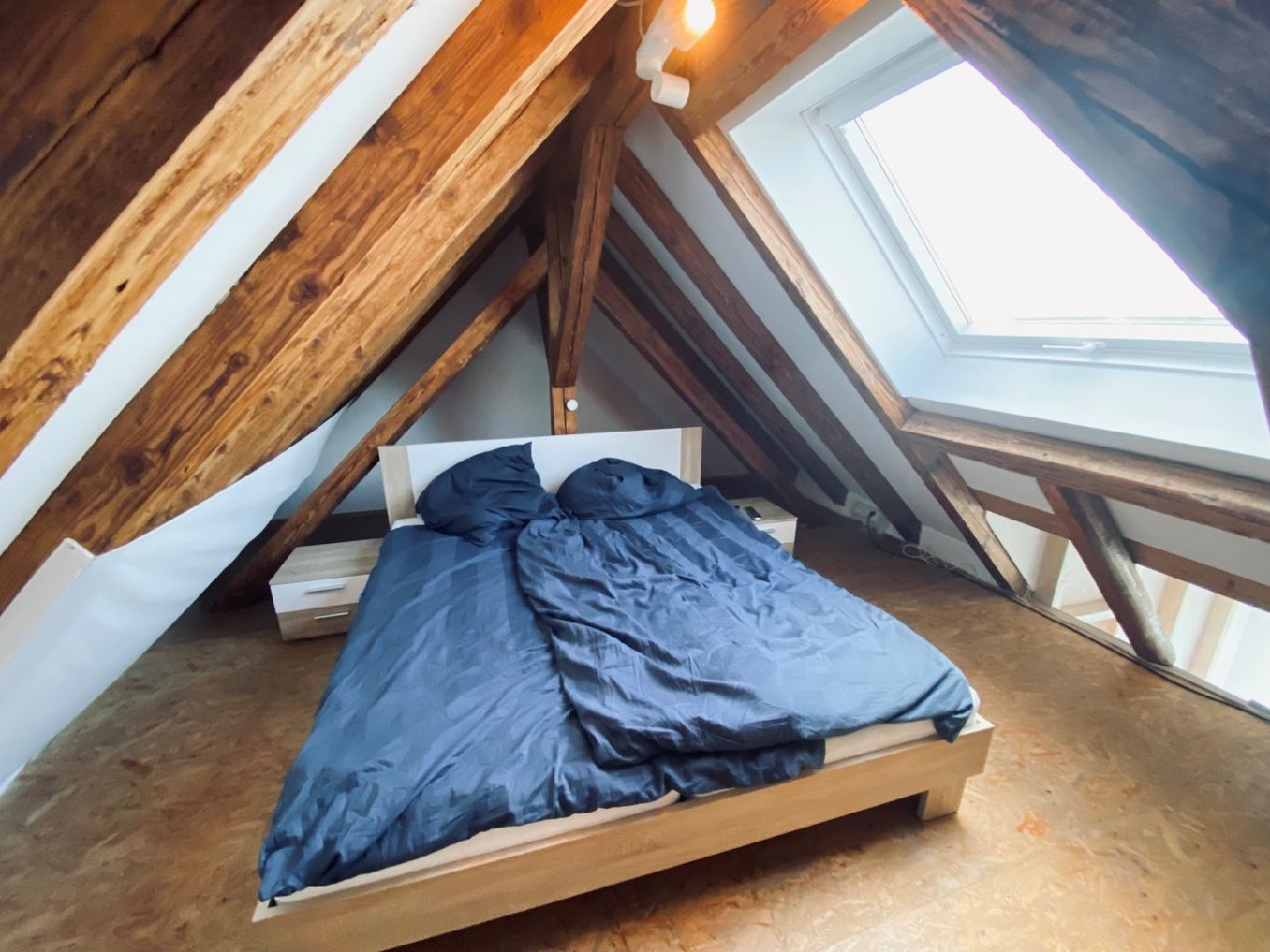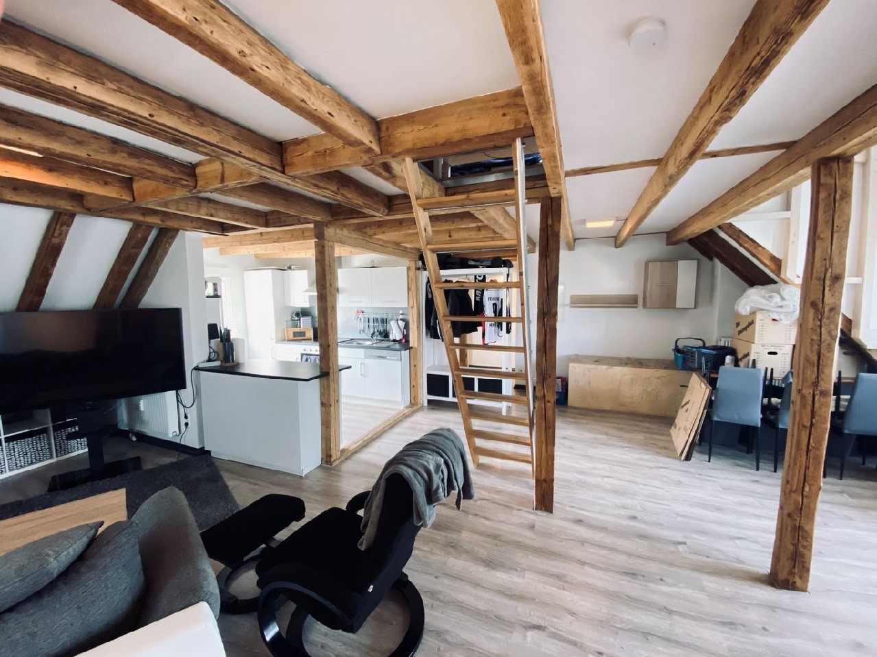 In fußläufiger Nähe zum Bahnhof wurde dieses 6-Familienhaus völlig neu gestaltet. So entstand im Dachgeschoss ein Loft. Ein großer Raum, alles offen - außer natürlich das Bad. Das Tageslichtbad ist mit Dusche und sogar mit einem Bidet ausgestattet. Eine Treppe führt in den offenen Spitzboden, hier steht das Bett.
