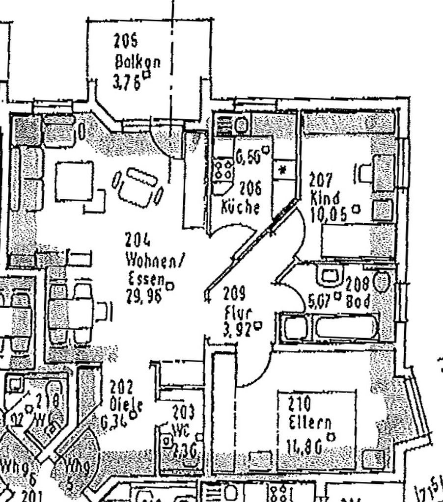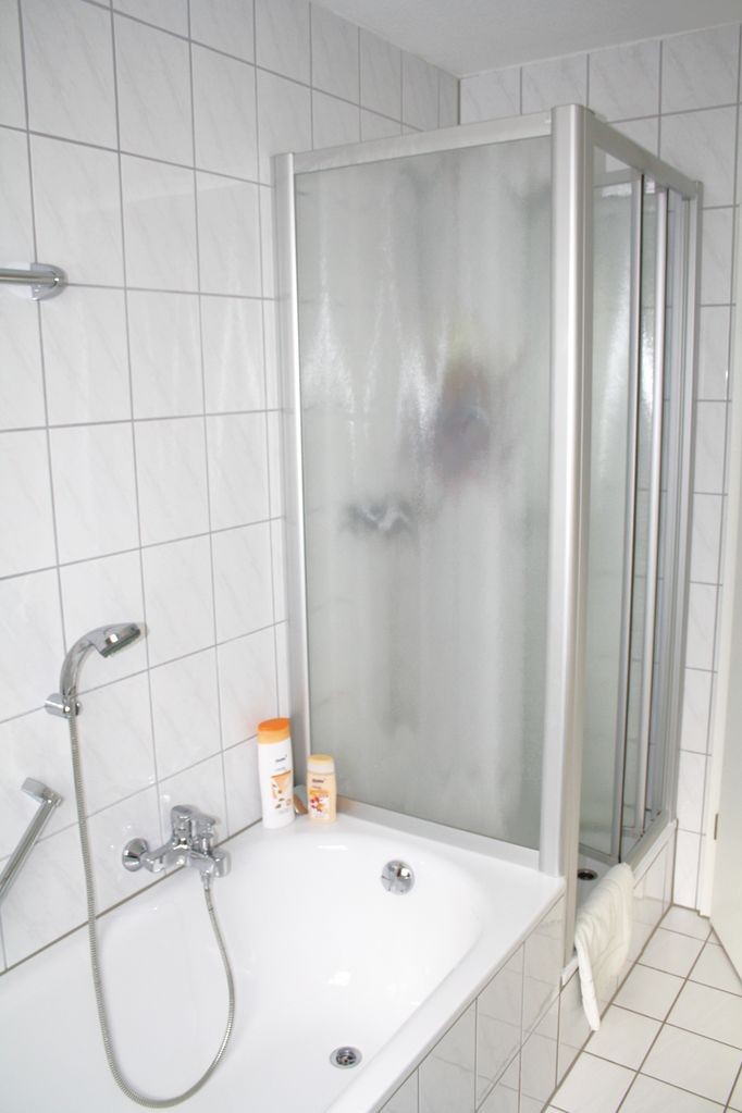 Ein großzügiger Eingangsbereich mit Schrankeinbauten für Garderobe und Schuhe, dass toll geschnittene Wohnzimmer mit Zugang zum Südbalkon, eine separate Küche (die EBK und die Waschmaschine können für EUR 100,00 übernommen werden), das Schlafzimmer kann mit einem 3m-Schrank bestückt werden, Kinder/Arbeitszimmer ist für seine Zwecke groß genug, ein Gäste-WC und das Tageslichtbad mit Wanne und Dusche. Die Wohnung ist komplett hell gefliest und ist mit Fußbodenheizung ausgestattet. Zur Wohnung gehört ein Doppelparkerplatz in der Tiefgarage, der zusätzlich EUR 50,00 kostet, weiterhin ein eigener Kellerraum und der allgemeine Waschkeller.