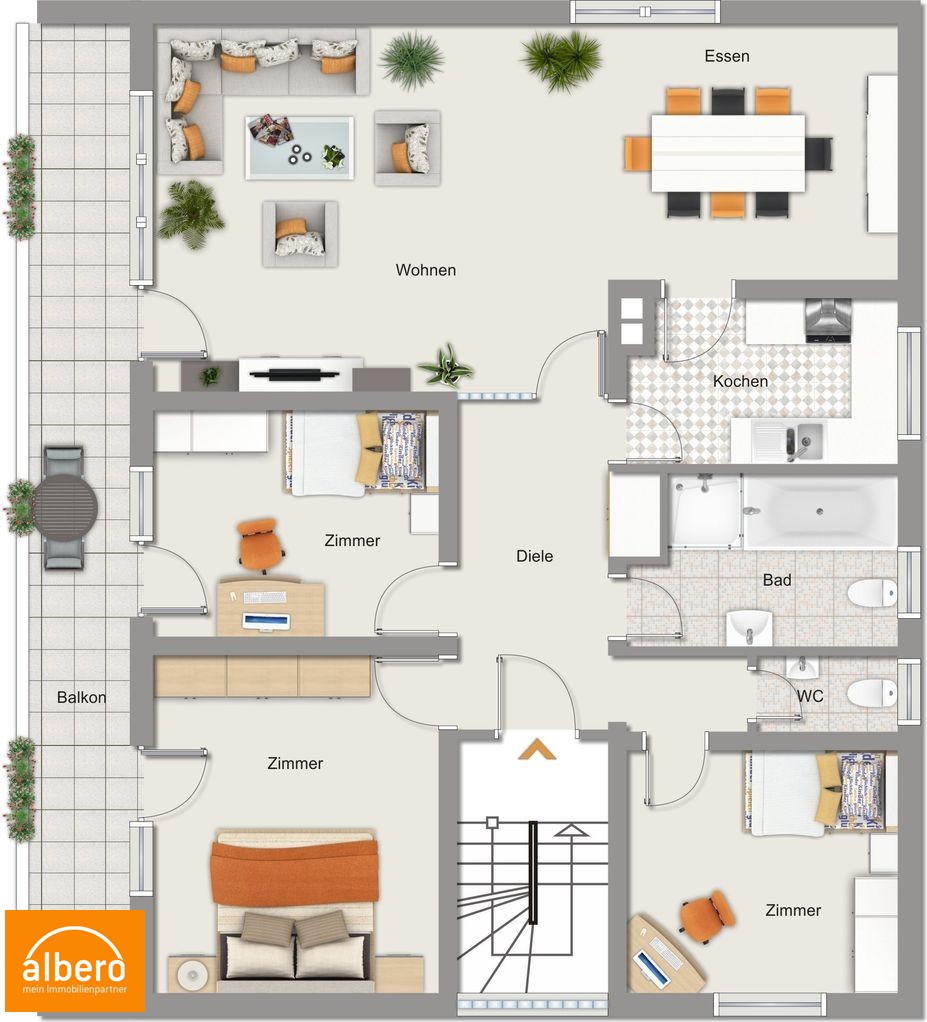 Balkon: ca. 20m², überdacht, Süd-West-Lage, Blick in den Garten und alten Baumbestand.