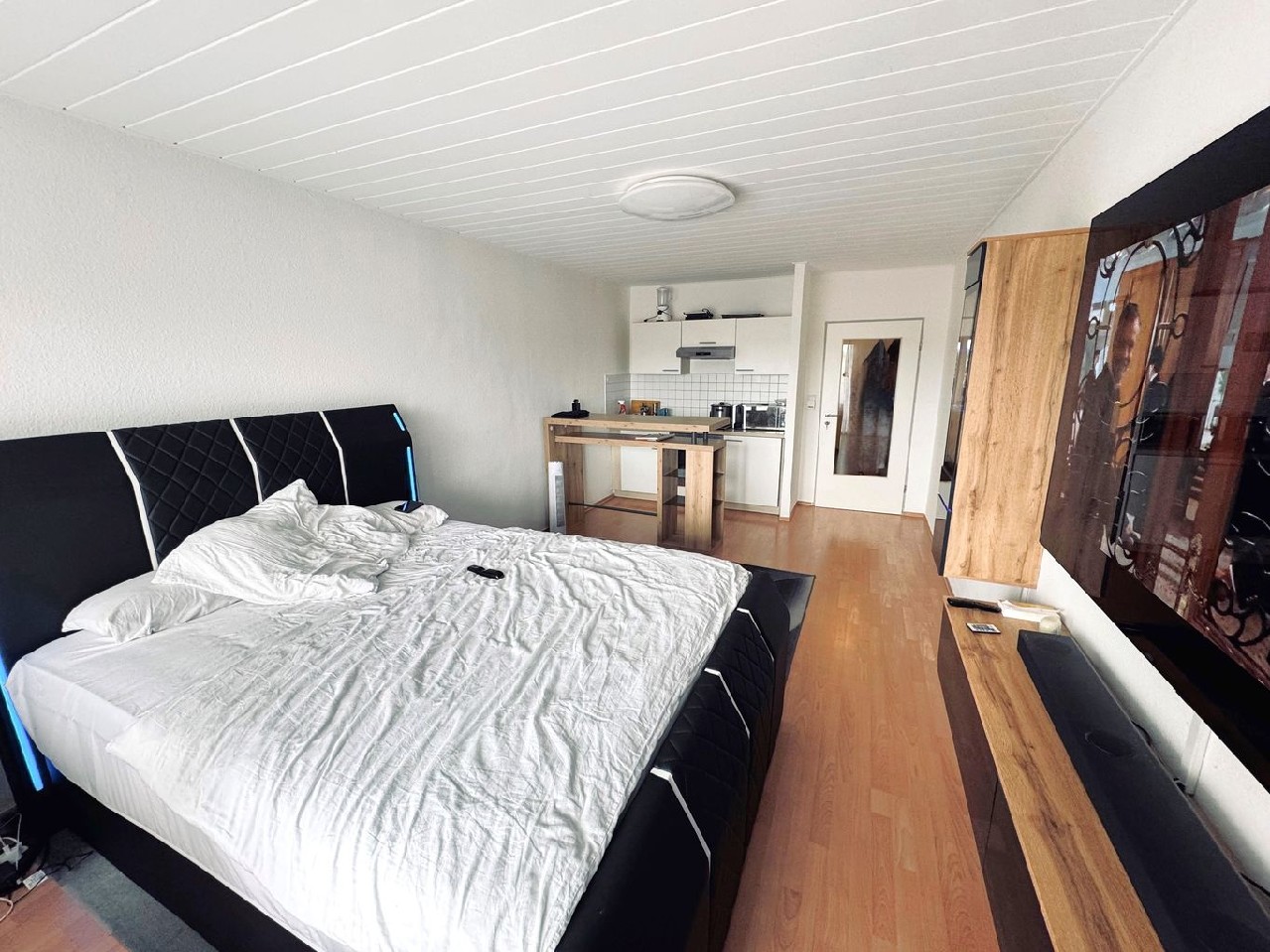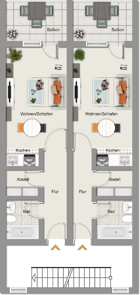 Ein kleiner Flur, von da aus ins Bad, das mit Badewanne ausgestattet ist, Waschmaschine und Trockner werden hier ebenfalls aufgestellt. Der andere Durchgang ins ca. 20m² große Wohnzimmer mit Ausgang auf den ca. 5m² großen West-Balkon.