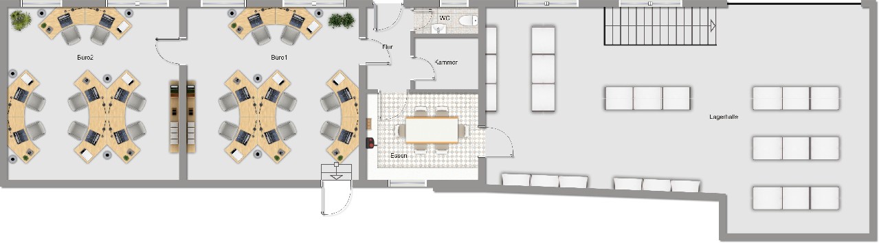 Im Gewerbemischgebiet in Hainburg/Klein-Krotzenburg befindet sich dieses vielseitig nutzbare Gewerbeobjekt mit zwei je 36m² großen Büroräumen, ein Raum für Technik, Drucker, Surver, eine schon eingerichtete Teeküche, ein WC und eine Halle mit ca. 93m², welche durch eine Wand geteilt ist, die auch entfernt werden könnte. Die Halle ist nicht nur durch eine Tür begehbar, sondern auch durch ein großes Sektionaltor, durch das auch ein LKW passt. Die Halle ist vielseitig nutzbar als Lager- oder Produktionsstätte. Zuletzt war eine Druckerei in der Halle. Im Keller befindet sich noch ein großer Abstellraum als Lager nutzbar.